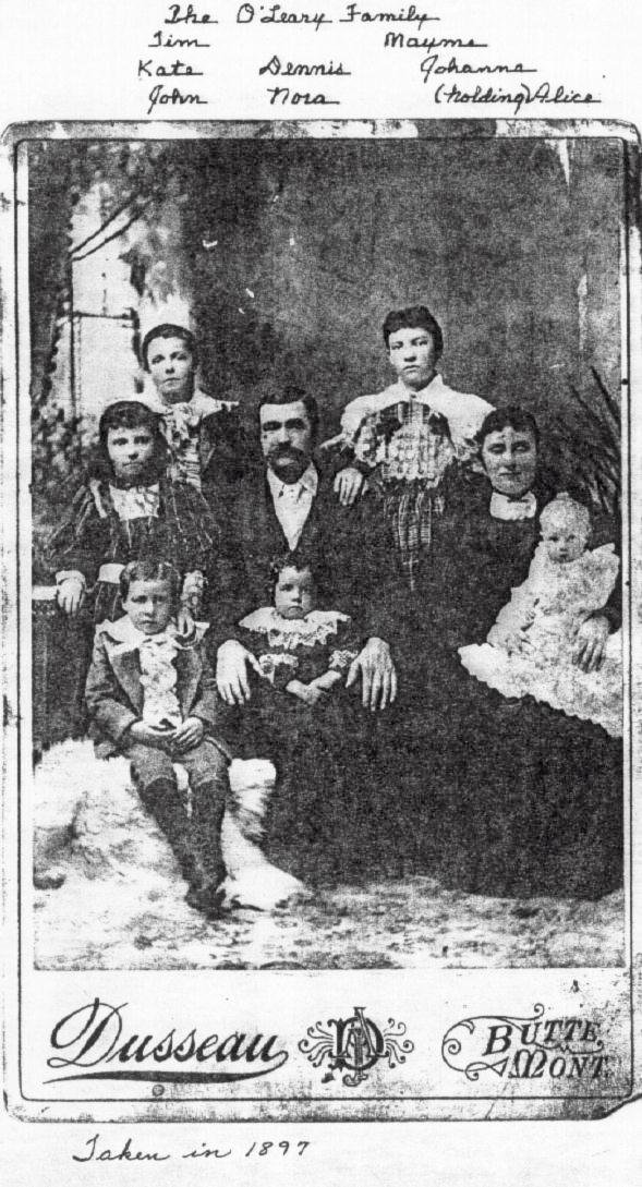 ARTICLE NO. 1, from The Butte Miner, May 30, 1912 **************************************************** DENNIS O'LEARY SUCCUMBS TO OLD WOUND **************************************************** Suffering 14 years from a bullet wound, Dennis O'Leary, 48 years of age, finally succumbed at his home, 613 Duggan Avenue, early yesterday morning from the old injury. His health had never been good since that time and he succumbed an easy victim to pneumonia. Mr. O'Leary was a native of Ireland and had been a resident of Butte for many years. He is survived by a wife and three sons, John, Dennis and Michael, and six daughters, Mrs. William Buckley, Mrs. Joseph Foley, Nora, Alice, Margaret and Gertrude O'Leary. A mother and sister of the deceased live in Ireland. Mr. O'Leary had been employed as a watchman at the St. Lawrence mine for years. He was a member of the Catholic Order of Foresters and the Catholic Knights. No arrangements will be made for the funeral until a sister, Mrs. Joseph Murphy of Globe, Ariz., is heard from. **************************************************** |