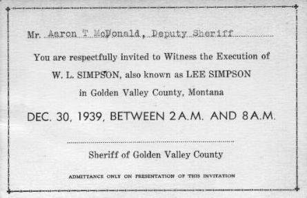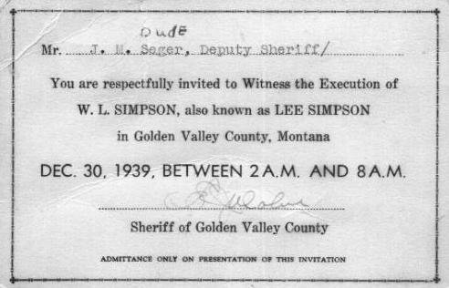 | April, 1938, local rancher, W.L. "Lee" Simpson confessed to murdering his hired hands, brothers Robert and Gerald MacDonald, and Deputy Sheriff Arthur "Buzz" Burford. The bodies of the slain brothers had been transported by Simpson and his wife to an area near the Roundup golf course and hidden. Deputy Sheriff, Burford, not knowing the MacDonald boys had been killed, had gone to the Simpson ranch with Sheriff Elmer Dolve to speak to Mr. Simpson about other matters. | |