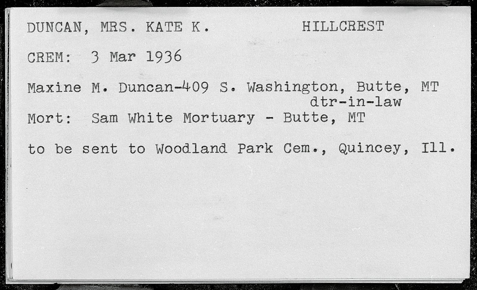 Kate Keath Duncan, widow of Lewis J. Duncan, former Butte mayor.
